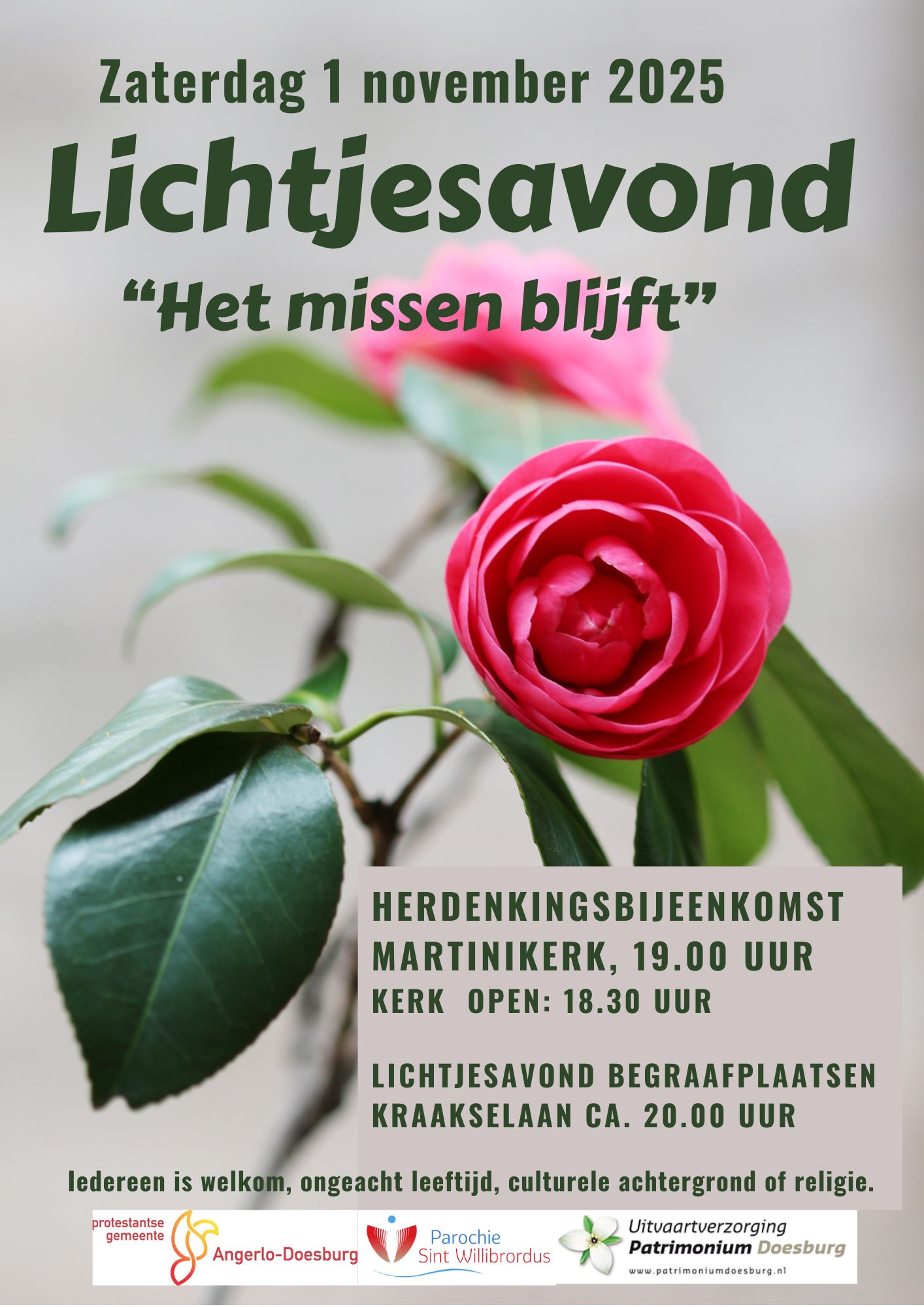 Het is een oude traditie om begin november stil te staan bij overleden dierbaren. Dit jaar organiseren Uitvaartverzorging Patrimonium, de Protestantse Gemeente te Angerlo-Doesburg en de rooms-katholieke kerk een lichtjesavond op beide begraafplaatsen in Doesburg. Het evenement wordt dit jaar mede mogelijk gemaakt door Ubbink en Stichting Kruiswerk.